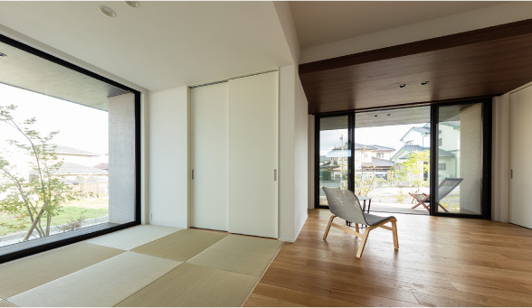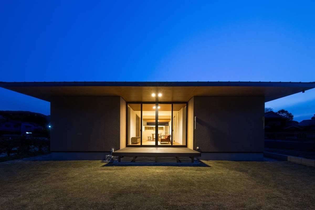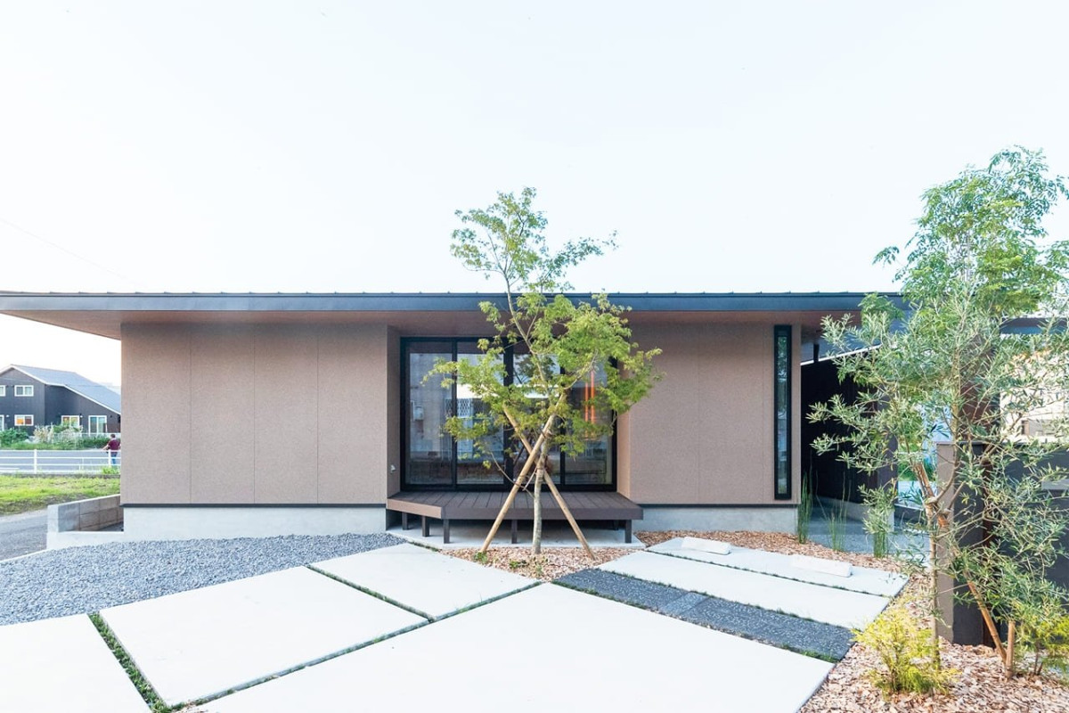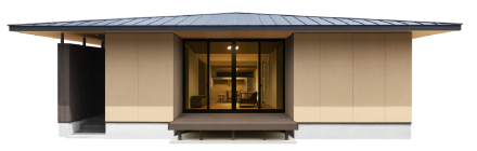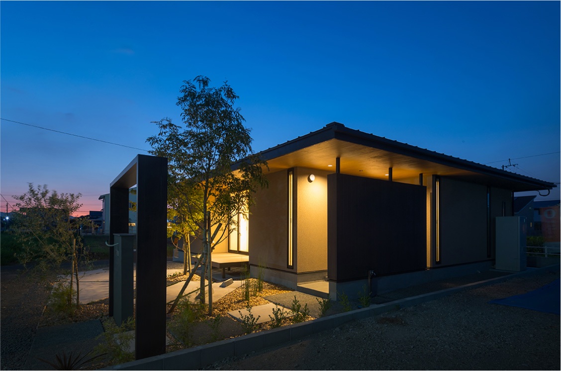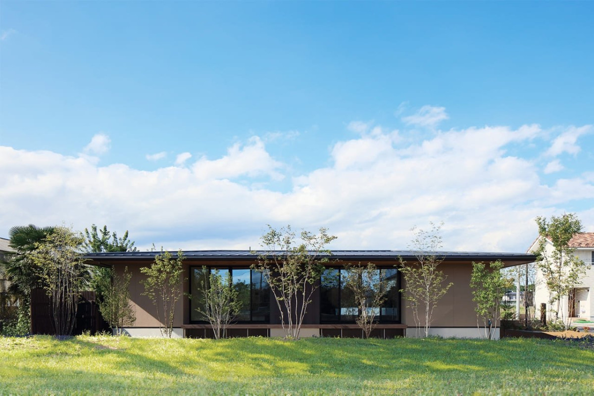 平らでどっしりとした屋根が生み出す安心感。 長き軒がつくり出す開放感。 リビングを中心に、各部屋がゆるやかにつながる一体感。
