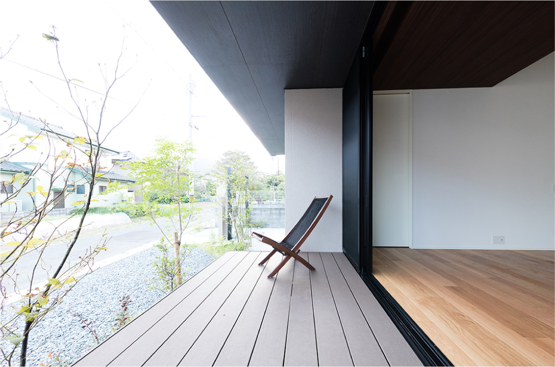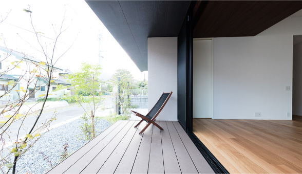 リビングから直接つながるデッキは、子どもには最高の遊び場であり、大人にとっては大切な憩いの場。デッキの素材には、腐食や白アリ被害などの心配がなく、メンテナンスが簡単な人口木材を使用しています。丈夫なので、どんなに走り回ったり飛び跳ねたりしても安心。天然の木粉が配合されているので、本物の木の質感や自然な温かみを感じられます。