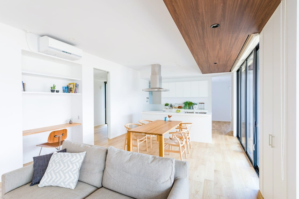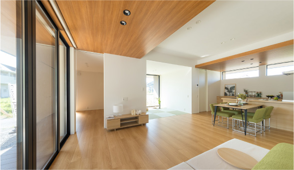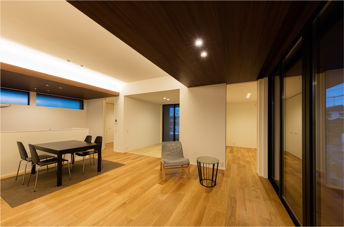 LDKはホテルのロビーのような折り上げ天井。折り上げ部分には、光を天井に反射させる間接照明を配し、優しい光を演出しています。窓は太陽熱を1/2前後カットするLow-e複層ガラスを採用。室内の涼も暖も逃しません。 そして床は、オークの突板を表面に施したフローリング。マット塗装で仕上げたので耐久性も強く、年月とともに色と深みが増す天然木の変化を楽しめます。