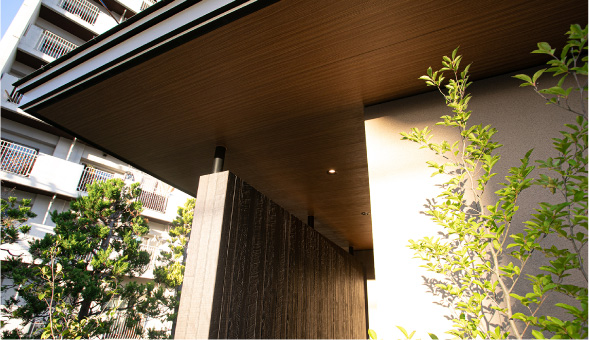 長い軒を持つフラットな屋根は、水平のラインを強調するために、軒と壁の境界線に小さな間を入れています。 3段のゆるやかなステップからはじまる奥行きのある玄関アプローチは、袖壁と天井部の間のスリットから漏れるやわらかな光が木目調の美しさを強調します。平らな屋根の下にあるので、雨の日でも安心です。